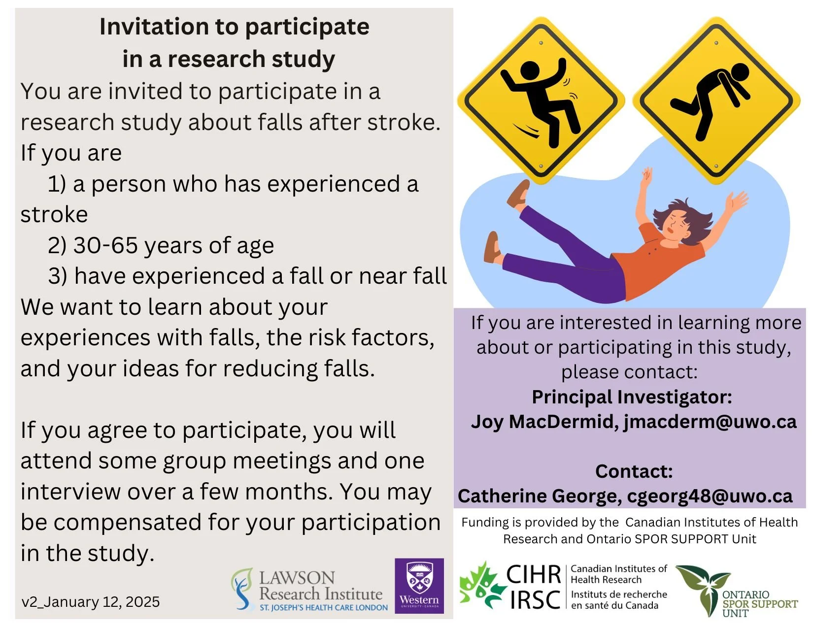 Stroke survivors are being invited to participate in a research study about risk factors for falls for people with stroke and ways to address these risk factors because you are an individual with stroke who has experienced a fall or a near fall, aged 30-65 years and live in the community. This is a doctoral student project. We are interested in understanding your experiences with falls and near falls.